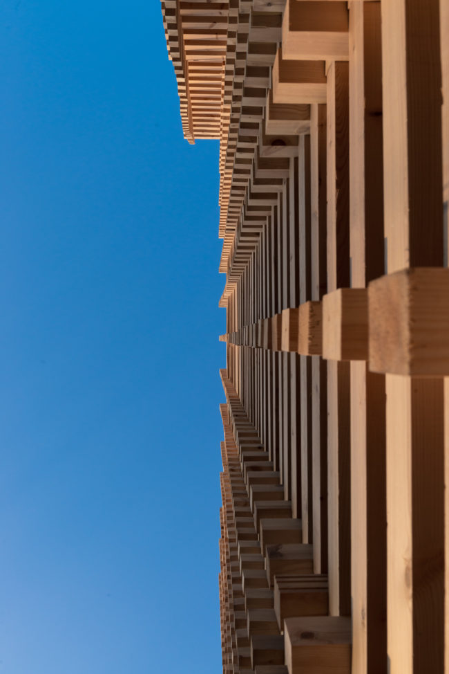 Ark22 is a gate between the desert and the city, embodying the supporting role of architecture to the environment. The project highlights the singular within the whole, emphasizing the importance that each of our actions has on the environmental disasters we are now facing. To reflect this idea, the structure is composed of over ten thousand identical raw wooden boards collected from local, sustainably managed forests, and is designed to generate regulated airflow inside the building. It is a pointillist accumulation of embedded wood timbers, built without nails or screws.
