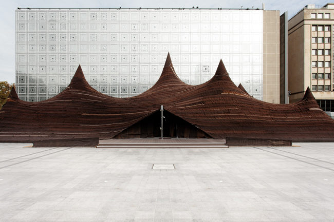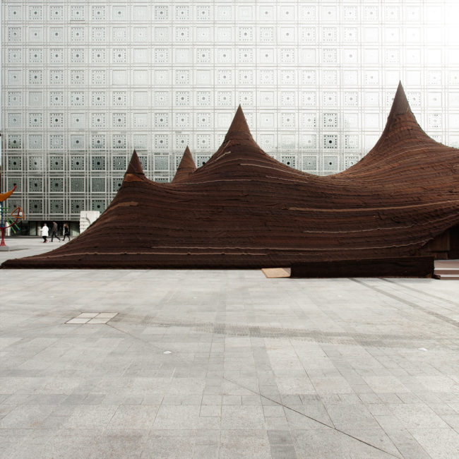 Installed in the forecourt of L’Institut du Monde Arabe by the River Seine in the very heart of Paris during the Contemporary Morocco exhibition, this gigantic tent is an innovative interpretation of the traditional “Frig” Saharawi tent. Entirely handwoven from camel and goat wool in the traditional way by a cooperative of Moroccan women, this flexible artwork covers a surface of five thousand square feet.